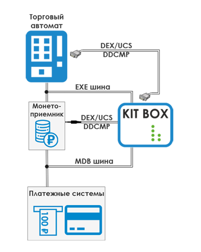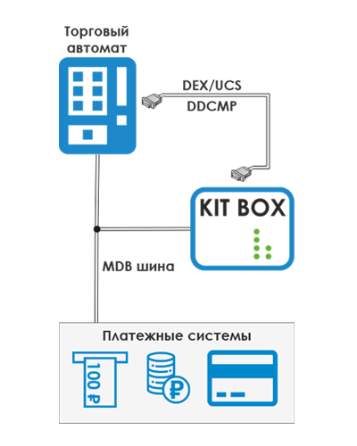Самое совершеннное решение на российском рынке. Совместим более чем с 98%торговых автоматов, представленных на рынке. Поддерживает весь функционал, реализованный в Kit Box, и открывает новые беспрецедентные возможности практически для всех моделей торговых автоматов: управление торговым автоматом и платежными системами, удаленное управление ценами, применение систем лояльности, подключение банковского терминала к ТА не поддерживающим работу с Cashless и многое другое.